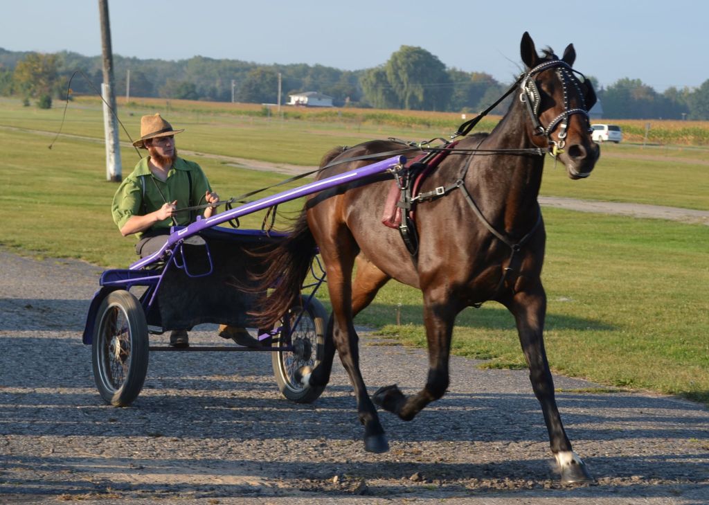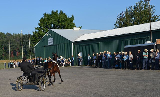 Before the auction begins, the Standardbred horses are harnessed and taken around the outside track for the bidders to observe.