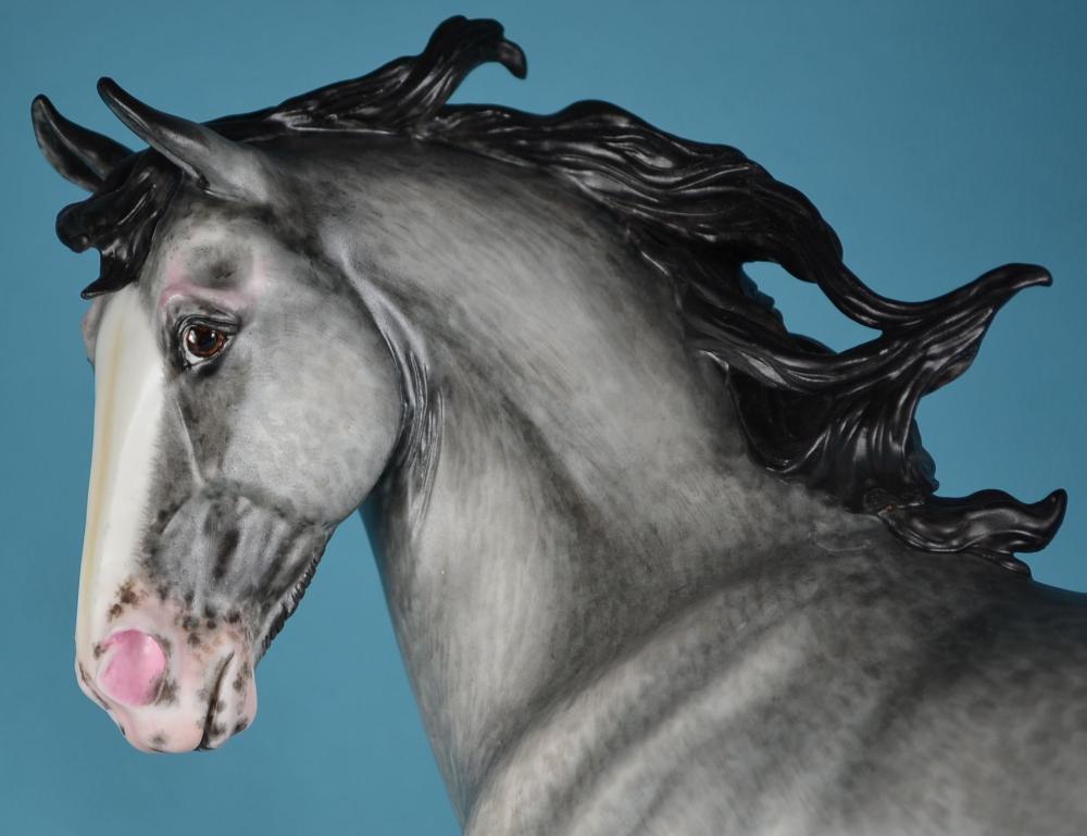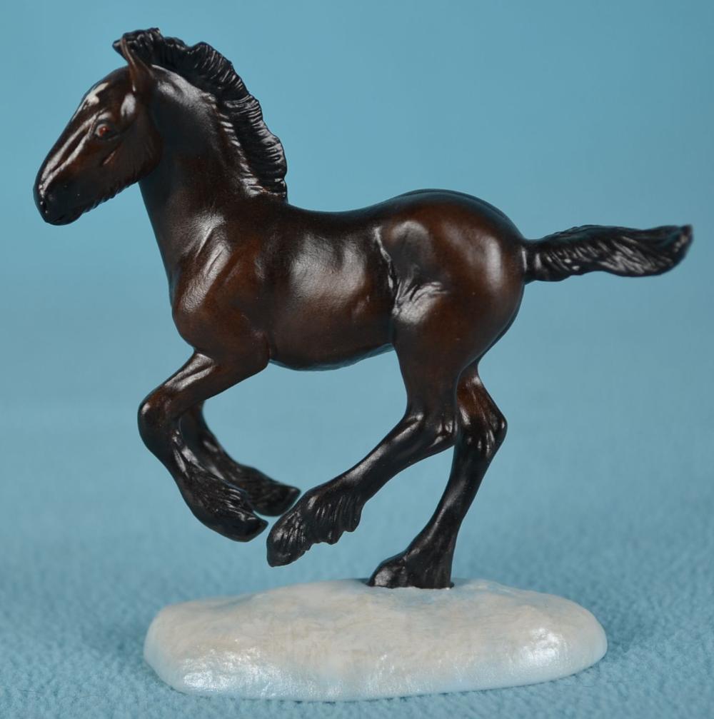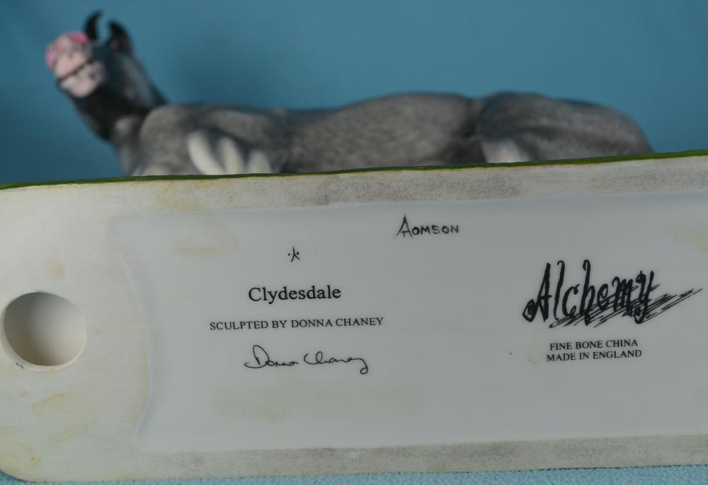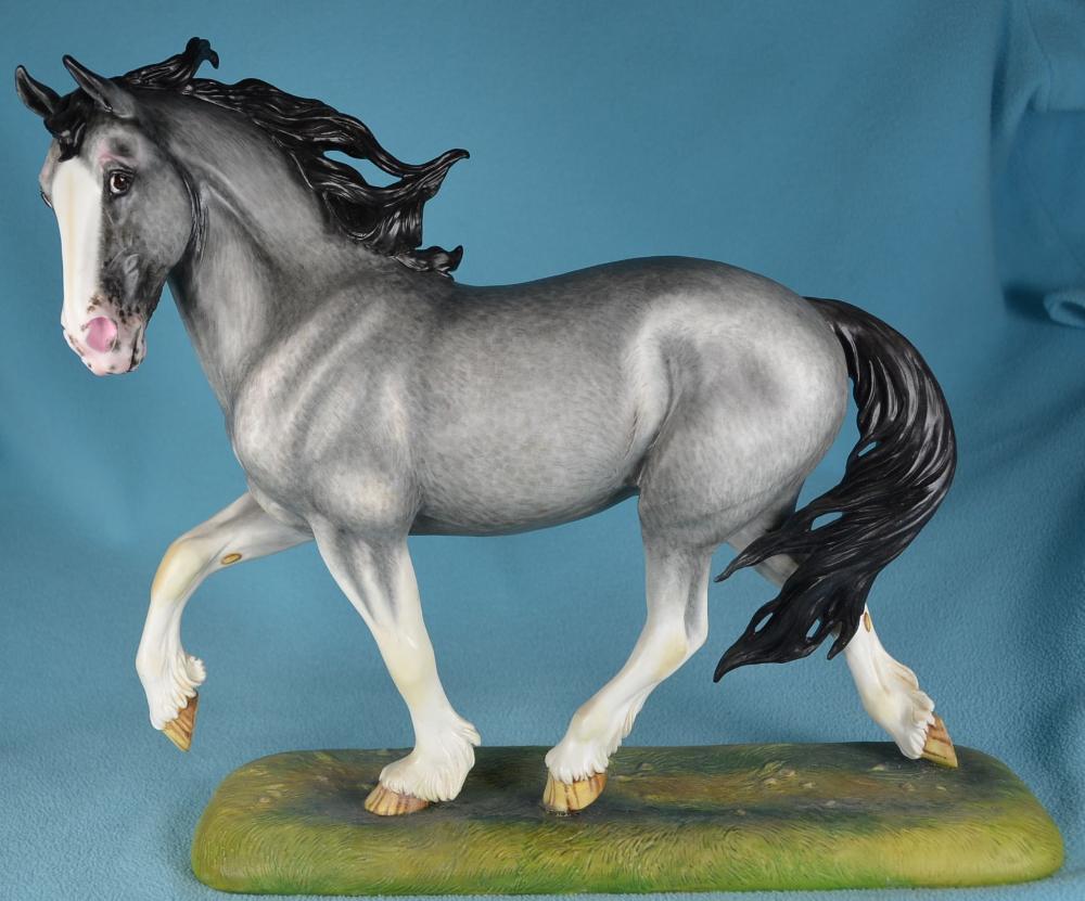 Many of the horses produced by Alchemy were miniature-sized (around 3″ tall). This massive Clydesdale stallion stands 10″ tall and is part of a limited run of 50 by Donna Chaney. It was available in roan or bay as a standard color, but this handsome gray with a textured-fur appearance is a custom color.