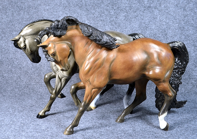 In 1983 Marshall Creations offered this ceramic horse in bay or white with various manes and tails. He is the same size and position of the plastic Hartland 10″ Quarter Horse stallion.